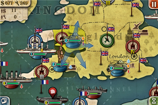 首先帝国模式下我们要做的就是扩展自己的领地利用手上的现有资源去占领敌军,在游戏中我们点击我们自己的军队会出现箭头代表可以前进的方向,蓝色代表安全方向,而红色这是代表我们需要进行战斗,胜利之后这块区域就能够由我们来控制。