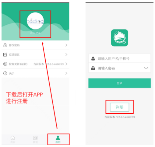 2.登录App,未有账号的需先进行注册,首次登录进行备案时需要完善个人信息。