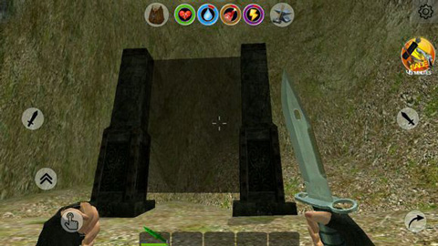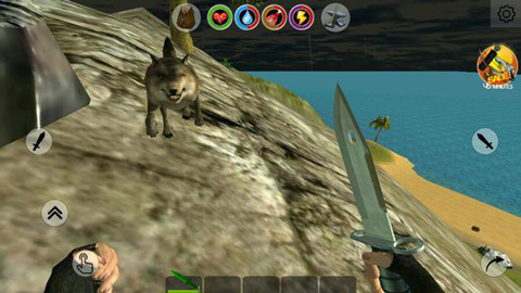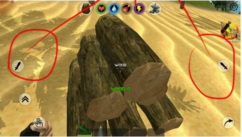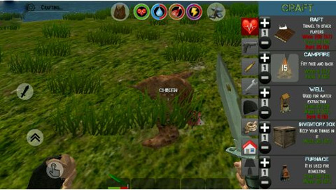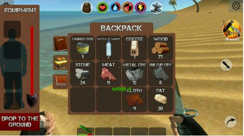 2、资源获取:刚开始时背包有小刀、一瓶水、一块生肉,看到地上有小石头、木枝时,走近时你会发现跳跃键上方有个键,赶紧点它收拾物品吧,走到树、石头时先用小刀获取,做了工具后再使劲收集,当树快砍光时它会显no的英文,表示已经不能获取木材了,但树不能倒下(好奇怪的设定),矿物快挖完时会消失,岛上有些地面上有成堆的木材那是无限获取的