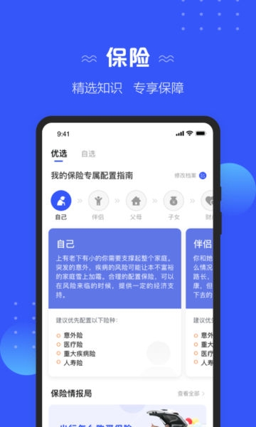 1、【保险】“优选”首页,简单输入几项信息,生成家庭保障方案,了解专业保险知识,获取保险资讯,选购精选保险