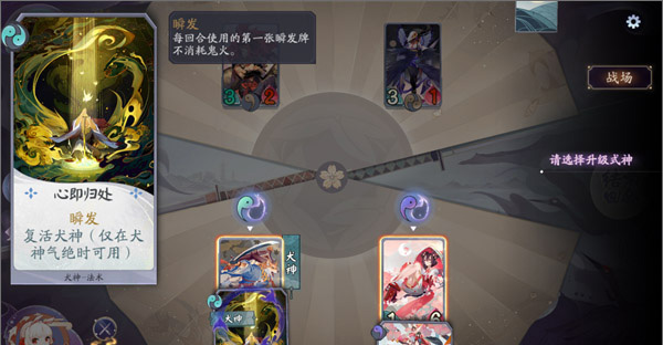 2、第二回合式神升级时,虽然选择升级两位式神都可通关,但最合理的应该是升级犬神。我们观察到手中的两张牌,犬神法术牌“心即归处”需要犬神达到2级才可使用,而桃花妖的法术牌“桃之馨息”1级就可以使用,所以当我们升级犬神后,两张牌都可使用,反之则不可。这也是我们对战中升级式神选择上的小技巧。