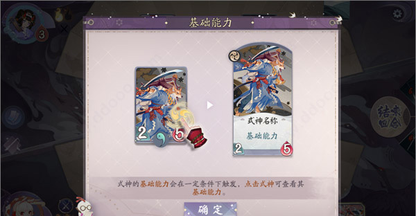 “基础能力”相当于式神的被动技能,会在式神牌的中间区域做详细描述,属于式神的核心所在。我们对局中不要忽略式神“基础能力”的存在,能巧妙地运用式神的“基础能力”,就可以帮助我们在对局中建立优势,从而赢得比赛。