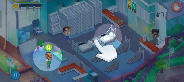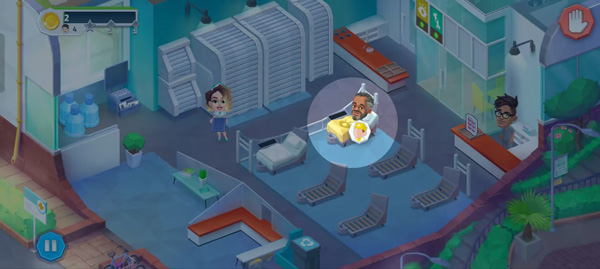2、进入关卡后会开始接待病人,你将控制一名护士完成各种操作,有病人来时你需要将他拖动到病床上,如果病人头顶的计时器时间耗尽你将失去这名病人。