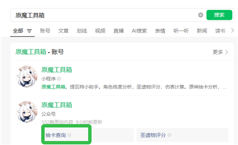 7、然后打开微信搜索【原魔工具箱】,点击【抽卡查询】。