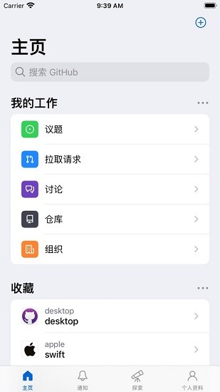 1、首先在本站下载并安装Github中文版,使用前需要先进行注册,登录账号后默认为主页,我们需要点击搜索进入搜索页面。