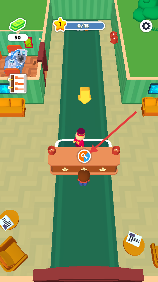 2、与前台人员互动,点击前台的图标,能触发服务环节,为客人办理入住等手续,推动酒店业务开展、积累服务经验。