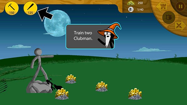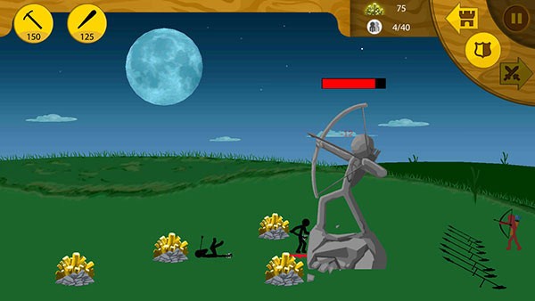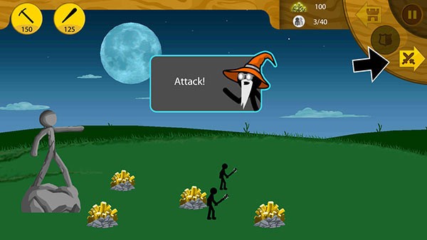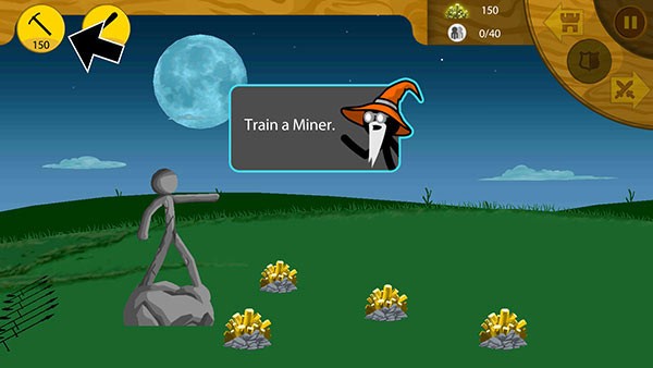一开始最好先出个矛,然后出8个矿工(因为一个矿最多只能两个同时挖,太多的话矿工会跑到对面的矿区去挖),然后等敌人来了后控制矛兵,然后让矿工撤退,让城堡弓兵射,你就顶个盾吸引伤害不让敌人打雕像就行了