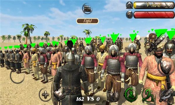 5、进度条右边的第一个按钮可以选择士兵的战斗阵型,不过兵力少时这个没什么用。我们的角色则是通过左下角的方向按钮控制移动,屏幕上有剑的按钮是攻击按钮,盾牌的是防御按钮,手指在屏幕上滑动来调整我们的视野。