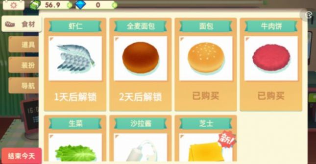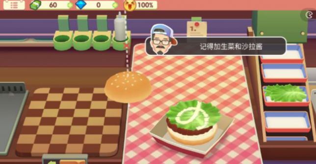 7、先将面包片放入餐盒中,将牛肉饼放到面包上,拖动生菜放到汉堡上。玩家可以随意放置肉饼和生菜的位置,点击沙拉酱在汉堡上长按滑动,美味的汉堡就做完了!成功解锁新食谱,牛肉汉堡。