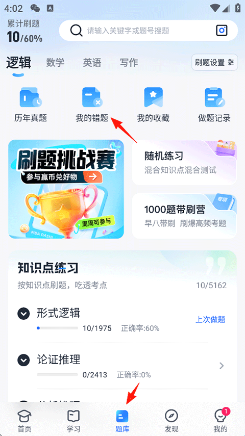 1、打开MBA大师,点击题库-我的错题。