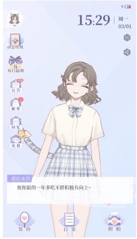 之后将正式进入次元世界,软件界面类似于手机主界面的操控,其中左上角显示的是当前时间,下方的功能则是:装扮、日常和照相。