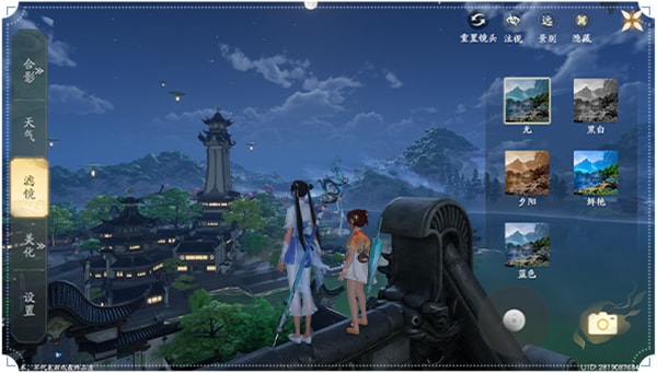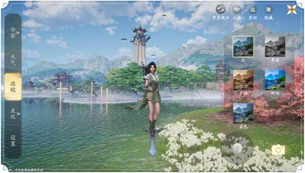 通过【天气】【滤镜】功能,可以选择多种滤镜和特效选项,调整游戏内的时间和天气状况,根据个人喜好改变场景氛围与照片风格。