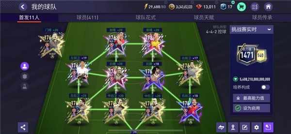 3、前场方面,在前锋位置这里我们选择了大奉先伊布,搭档最新的四周年之星典藏版哈兰德,伊布的出色体格让对方后防十分难招架,且在射门和抢点方面都是顶级水平,而哈兰德则拥有不俗的对抗,出色的启动速度和灵动的跑位,是一名非常顶级的前锋,两人搭配保证了锋线的火力输出。后腰方面,选择后腰一哥佩蒂特搭配古利特的客串,佩蒂特防守覆盖面积大,断球干净利落,而古利特在佩蒂特的掩护下,在防守的同时能推动反击,同时能胜任中场持球点,两名后腰搭配攻守皆备。两名边前卫则选择孙兴慜和巴拉克搭档,孙兴慜作为边锋客串,有着非常快的速度和优秀的传中,同时个人能力很强,是边路爆点,巴拉克则是中场六边形战士,能胜任各种位置,模型非常出色,跑动十分积极,设置为边前卫无论是进攻还是防守都能积极参与。中后卫方面我们选择防守能力非常出色的布兰科搭档斯塔姆,两人负责包揽中后场的高空防守和地面拦截。边后卫方面我们选择了马尔蒂尼搭档范迪克,两人都拥有不俗的的体格和凶狠的防守,对于想突破边路的对手都能轻而易举的将球断下,四人组成的后防线总体高度非常足,因此能轻松拦截威胁高空球。