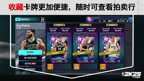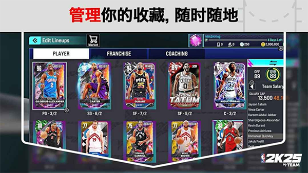 3、除了基础卡牌收集外,《NBA 2K25 MyTEAM》还支持球员升级、装备强化、技能点分配等功能,玩家可以根据战术需要定制每位球员的成长路径,提升球队整体战斗力。
