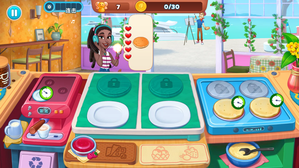 玩家需要进入游戏关卡为顾客制作他们心仪的食物,每个关卡都有通关目标
