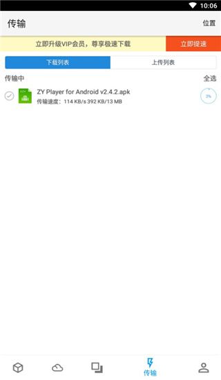 点击下载按钮后,就会在软件下方第四个图标传输界面开始下载,如下图: