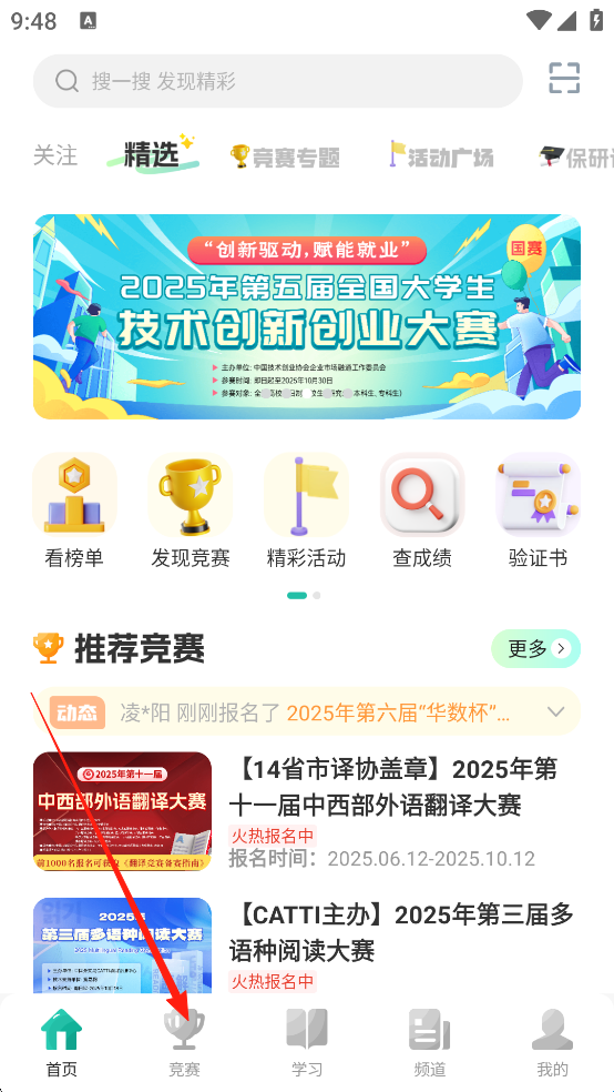 3、在搜索引擎中输入比赛两个字,就能很快地找到比赛的内容。同时在网上和其他大学生聊天,也能扩大你的交际圈。