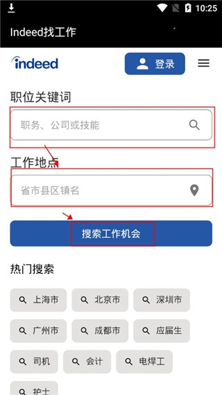 2、进入软件后即可体验,输入自己想要的职位以及地方,点击搜索即可;