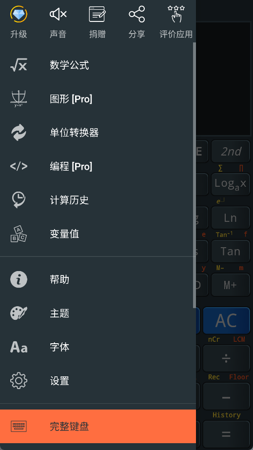 1、打开软件后点击左下角菜单选择 “完整键盘”,切换为科学计算器模式。
