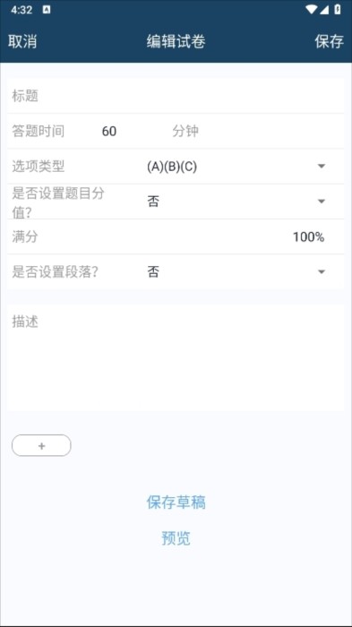 导入结束后,会出现信息填写的界面,您需要填写这个试卷的标题、分数、答题时间等信息。根据提示填写完成后,点击保存即可。
