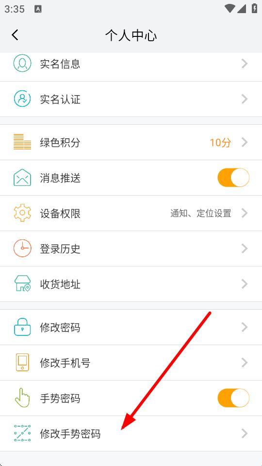 4、在个人中心页面里,找到并点击修改手势密码选项,然后按照提示操作,绘制新的手势密码并确认,即可完成修改。